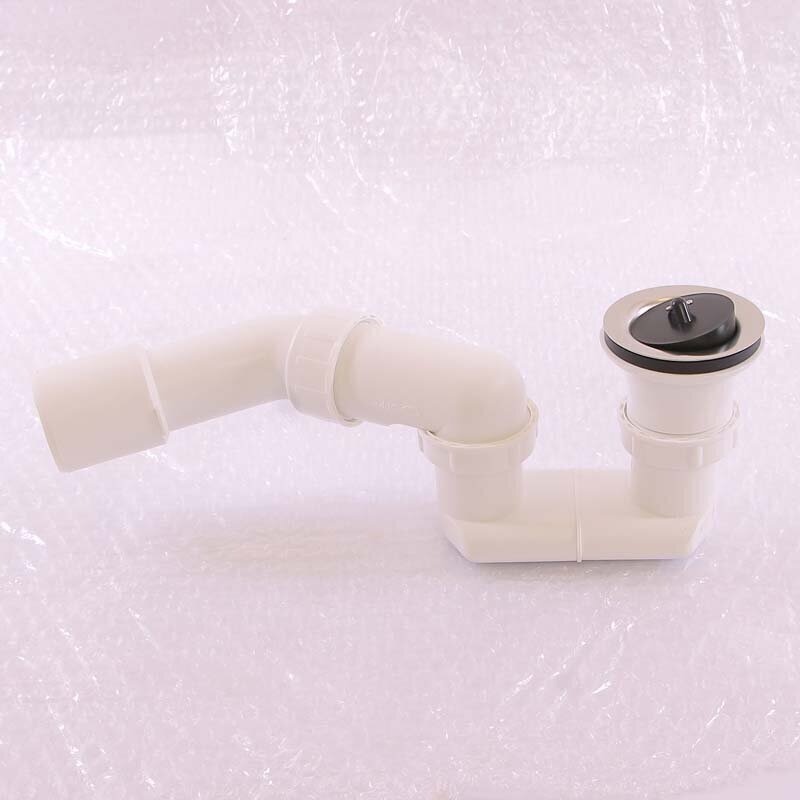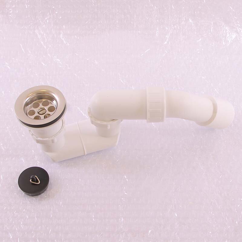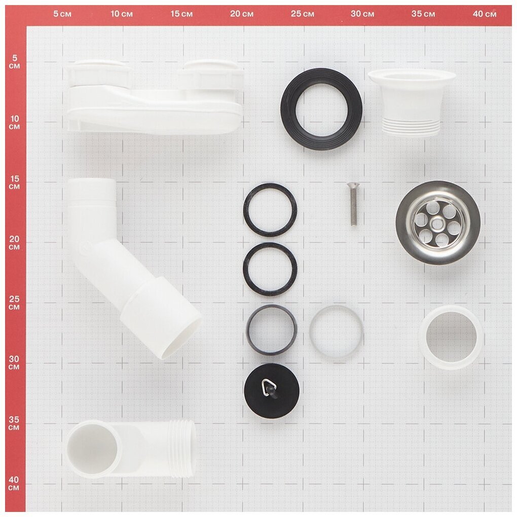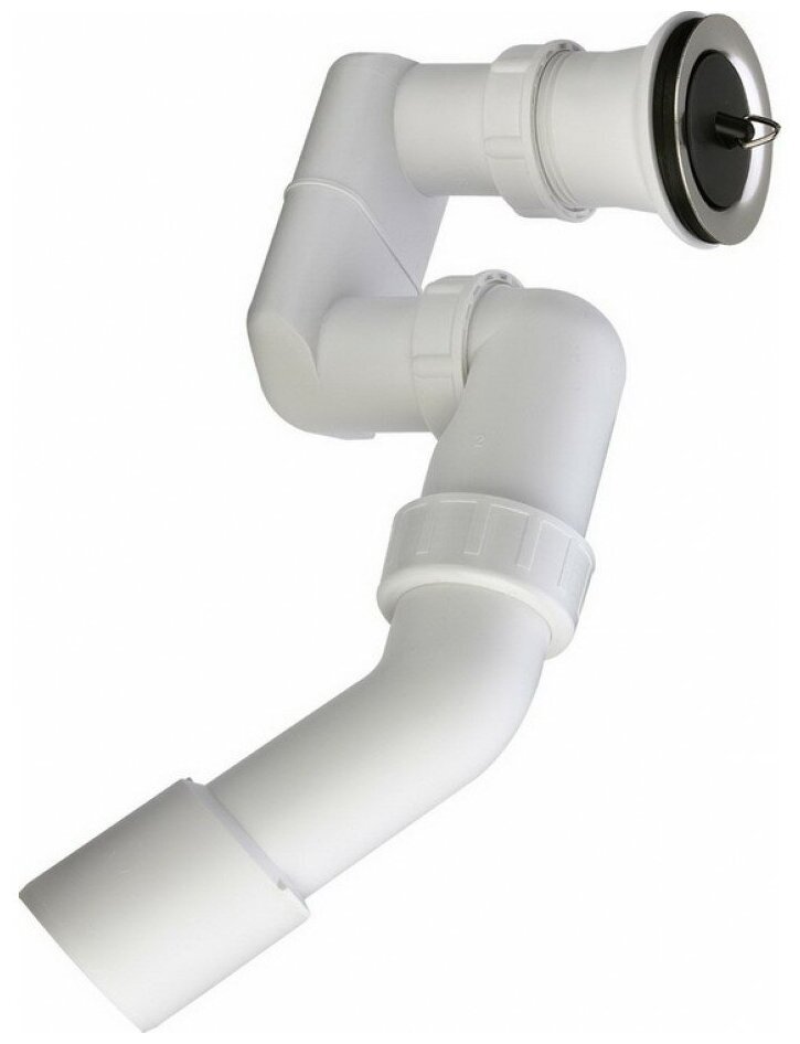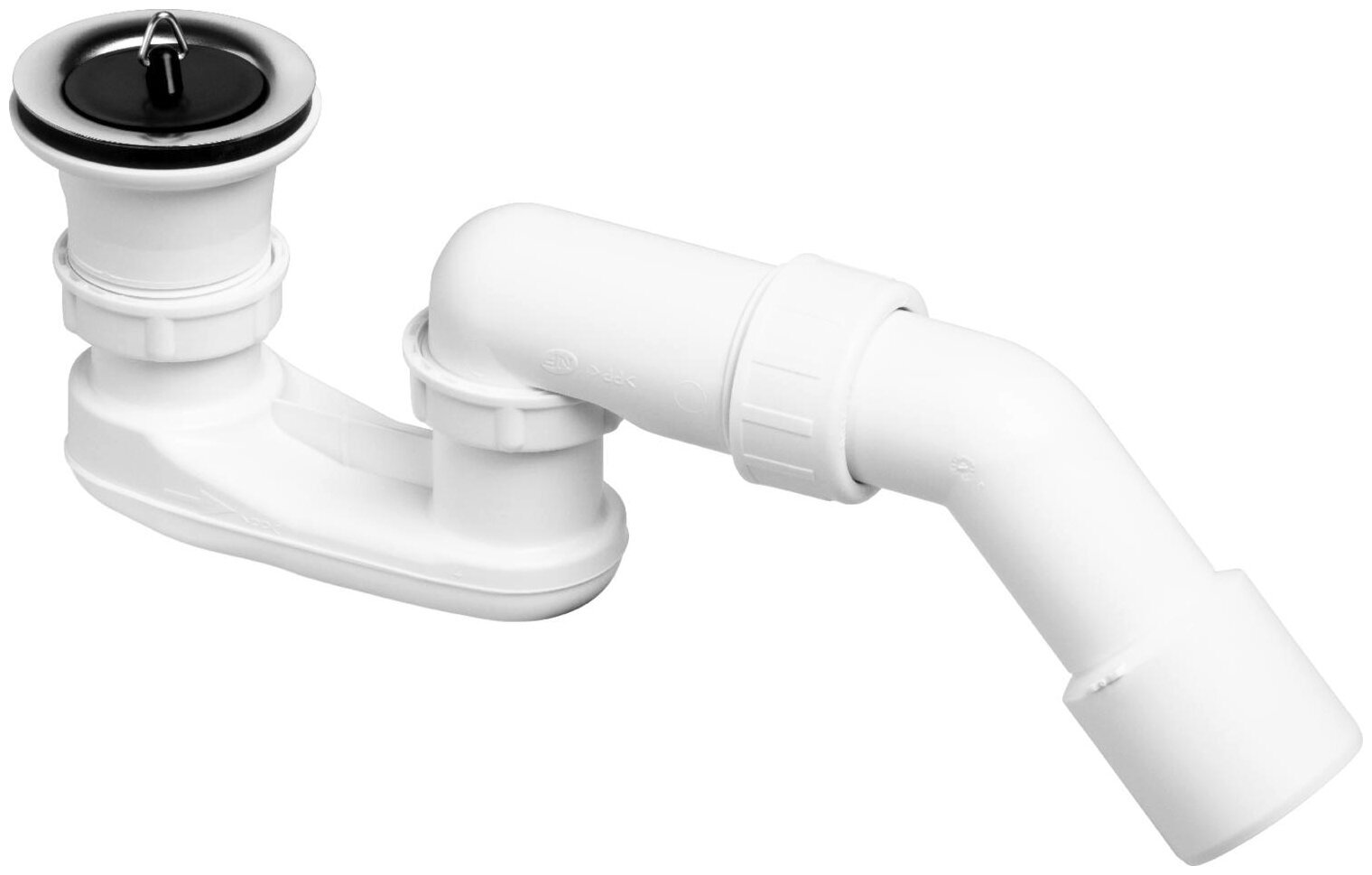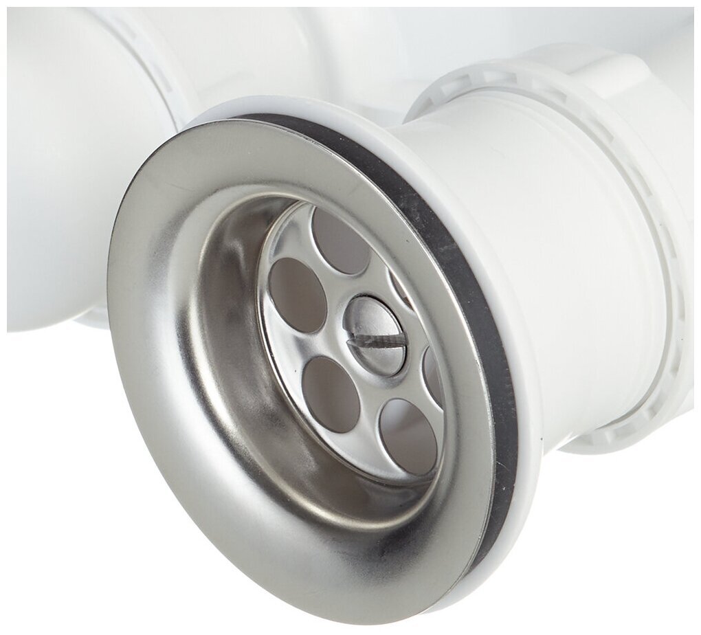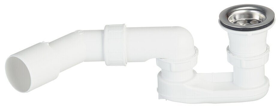 Верхняя часть выпуска выполнена из нержавеющей стали, что обеспечивает долговечность и стойкость к коррозии. Отводящее колено имеет угол 45°, что облегчает установку и подключение сифона.
