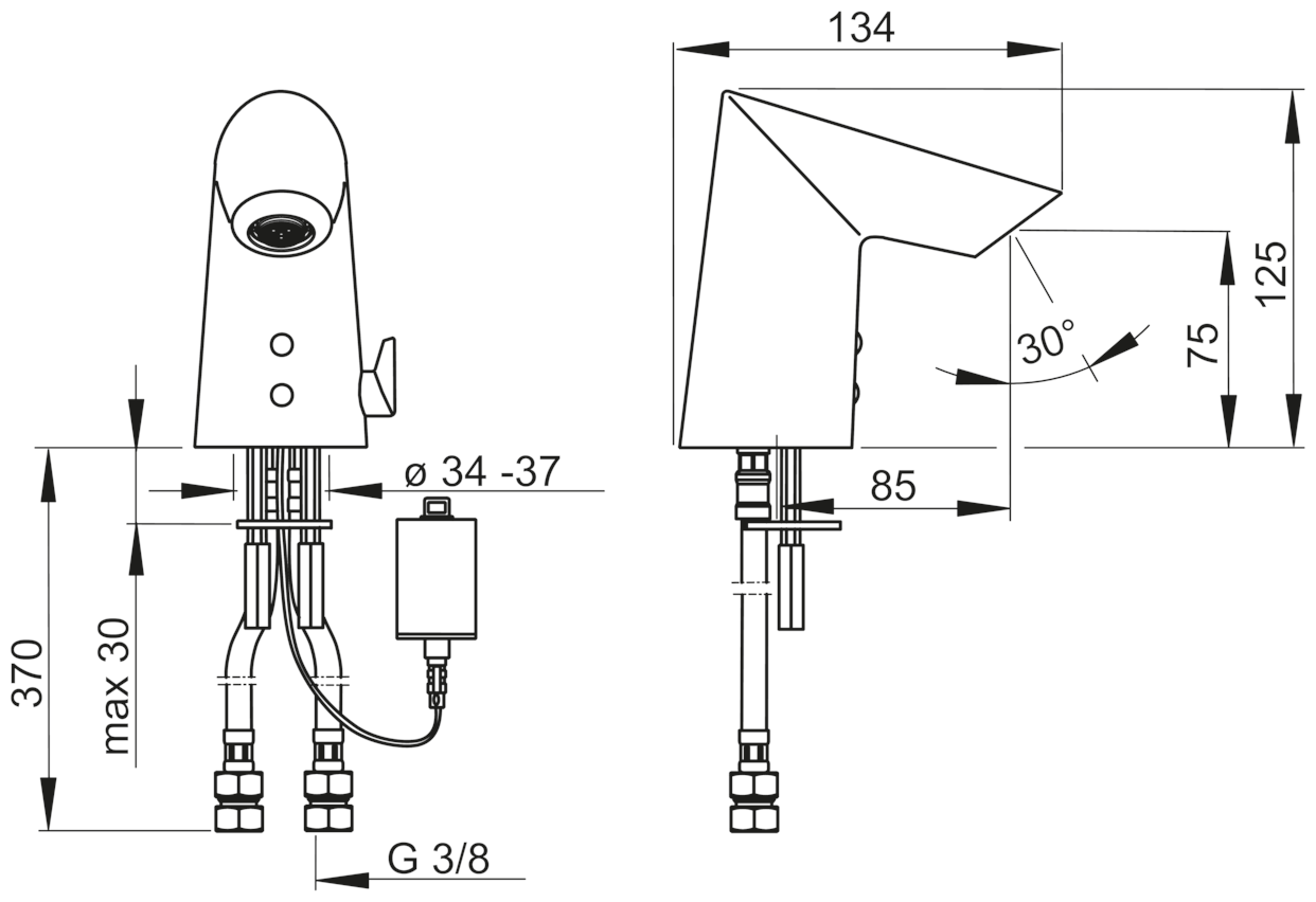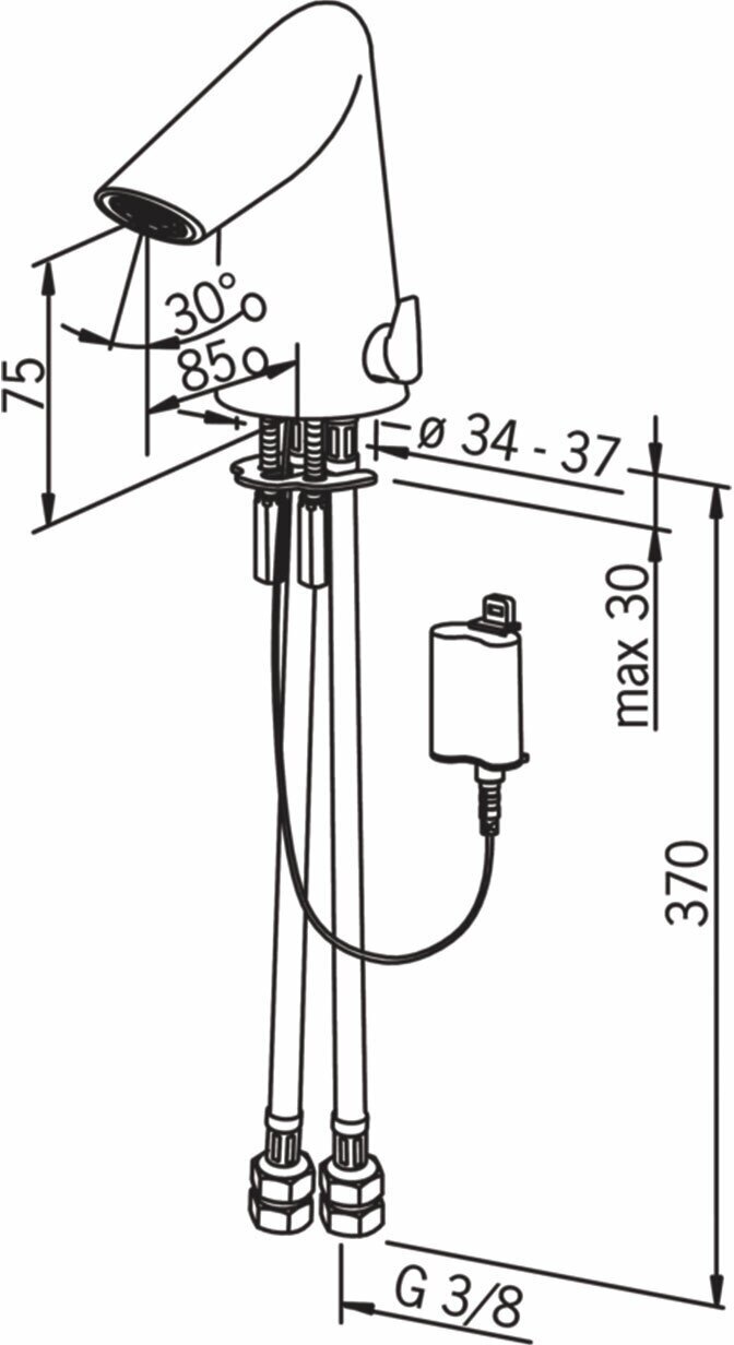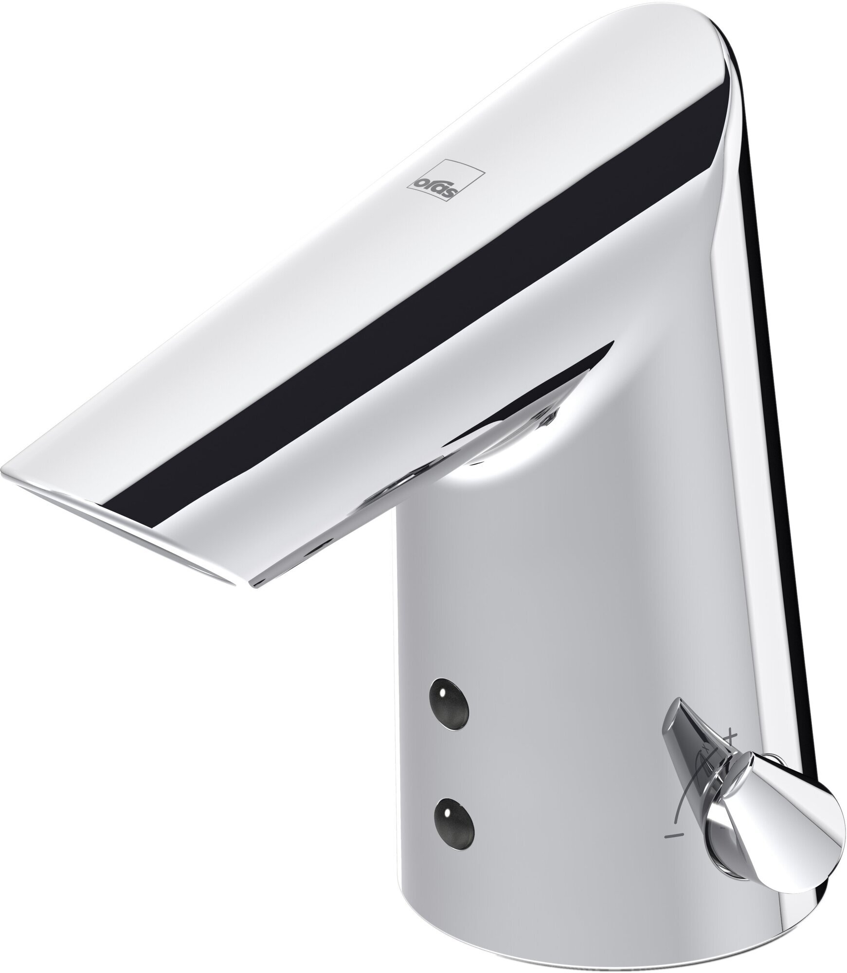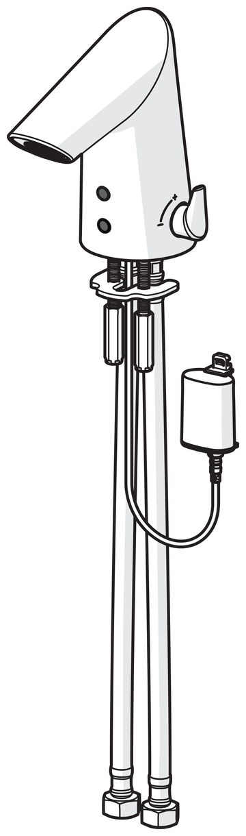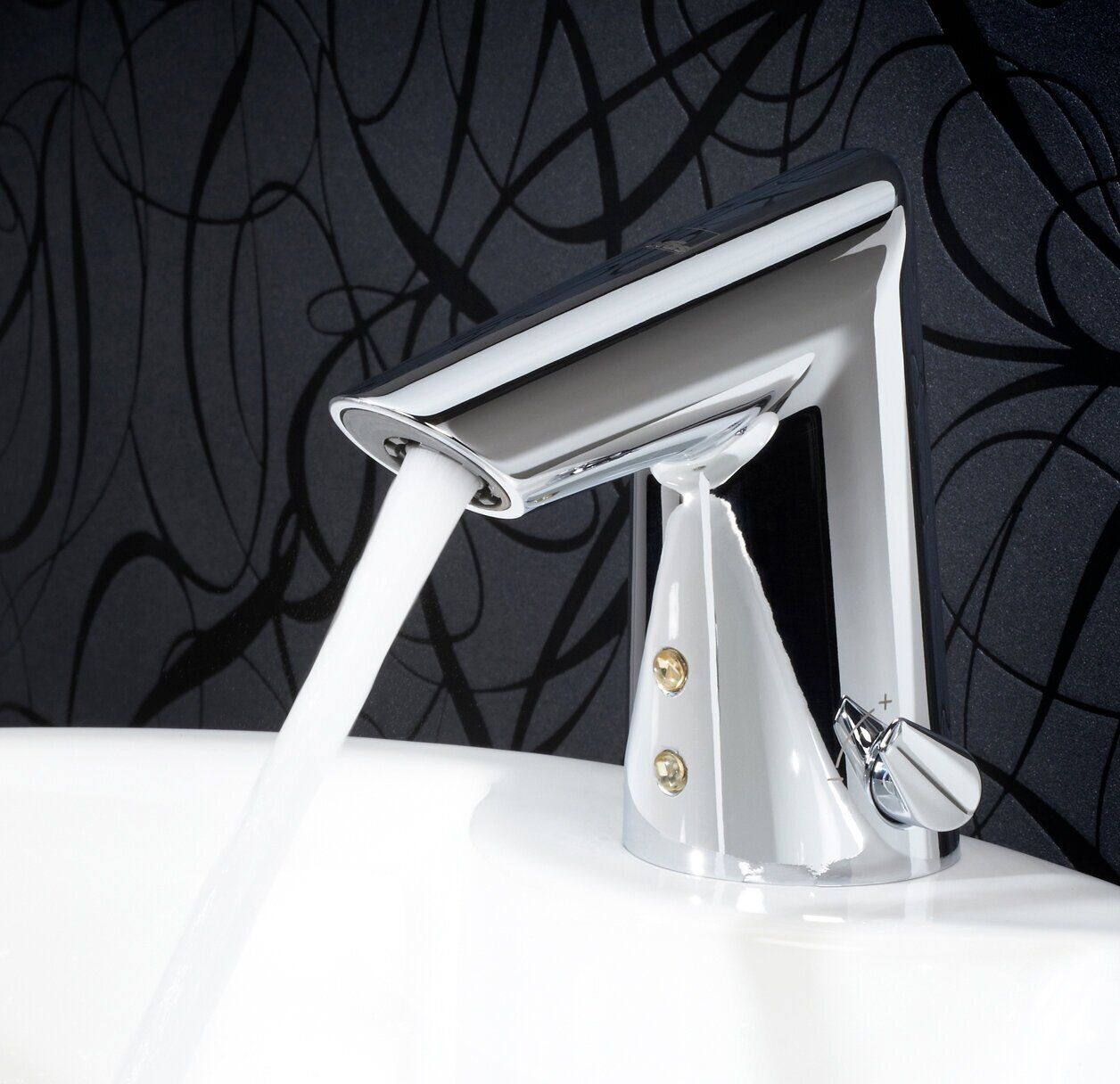 Смеситель оснащён рукояткой регулировки температуры воды. Он работает от батарейки 6 В (тип Lithium 2CR5). Импульсное управление работой клапана обеспечивает увеличенный срок службы источника питания.