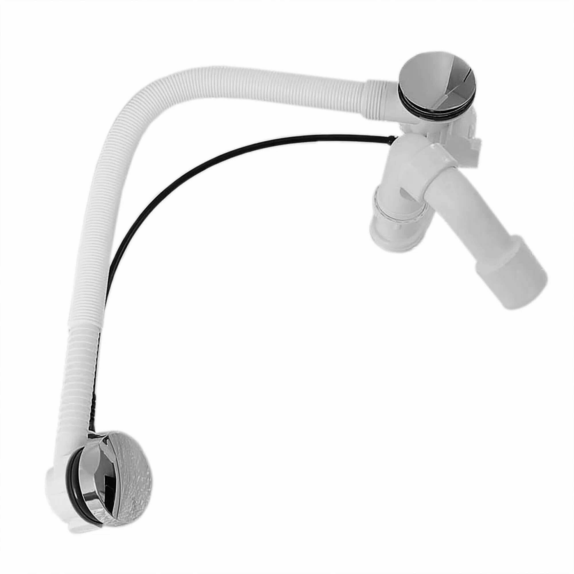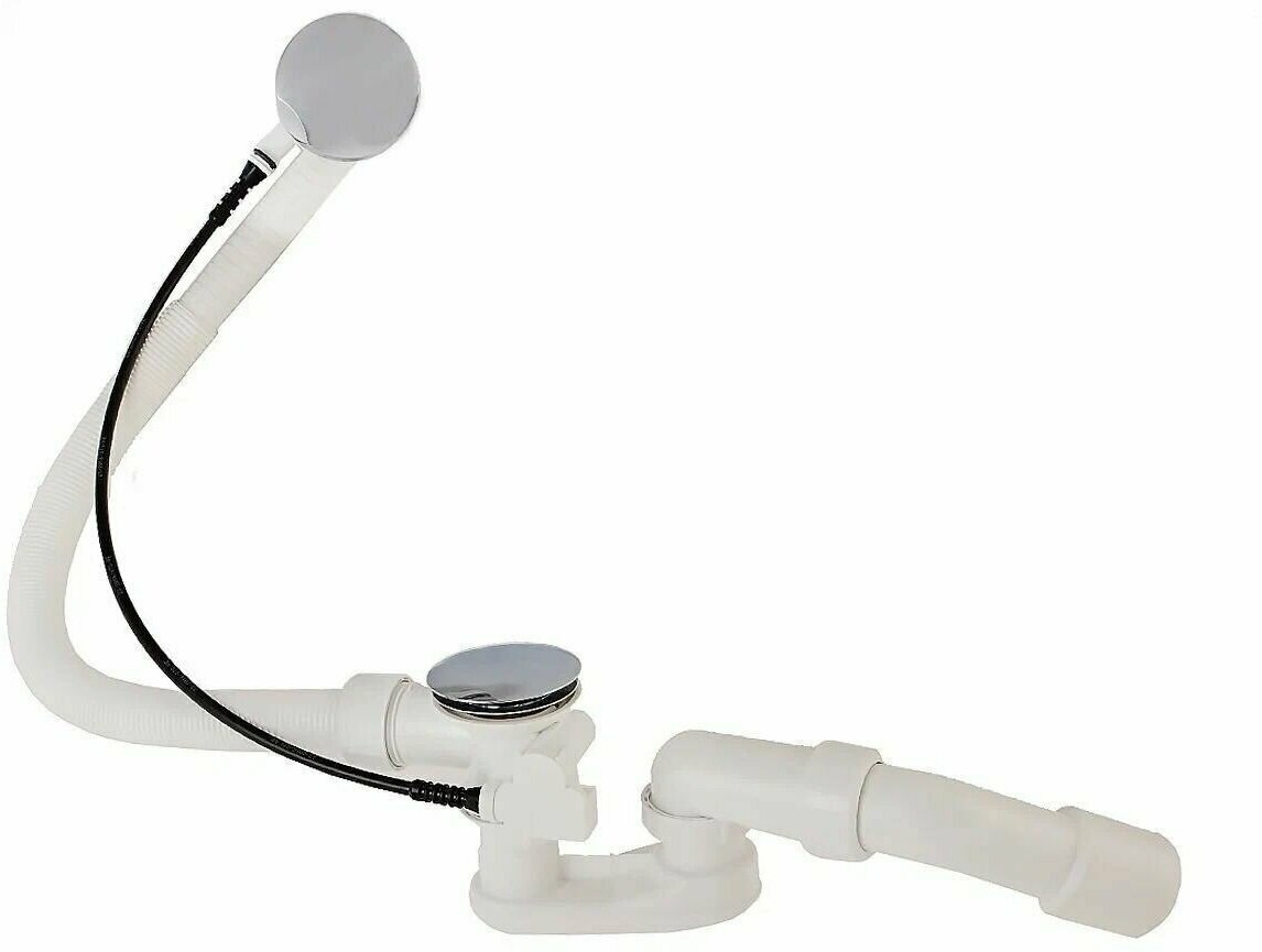 Комплектация слива-перелива включает гибкую переливную трубу, хромированную поворотную накладку переливного отверстия, хромированную пробку донного клапана, гидрозатвор и отводящее колено 45°. Верхняя часть донного клапана изготовлена из нержавеющей стали, что гарантирует долговечность и надежность конструкции.