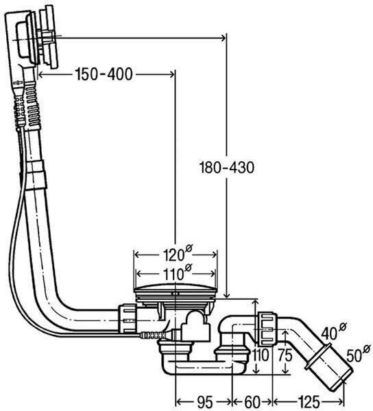 Слив-перелив Viega Simplex имеет длину тросикового механизма 725 мм, что позволяет легко регулировать его высоту. Диаметр подключения составляет 50, 40 и 32 мм, а диаметр выпуска - 52 мм, 1 1/2" и 40 мм.